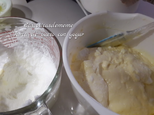 En el bol de las yemas, ponemos el azúcar, batimos hasta que se vea integradas, páramos, añadimos el queso y la ralladura de limón, volvemos a batir hasta que se integre, añadimos el zumo de limón, volvemos a batir, añadimos la maicena, batimos todo hasta que nos quede una crema espesa.