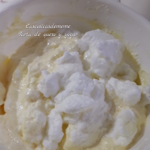 Cambiamos a una espátula, vamos incorporando las claras en tres veces, de forma envolvente sin batir, solo mezclar, ya tenemos la tarta preparada para hornear.
