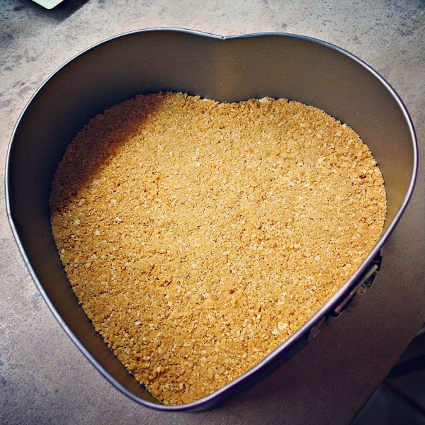 2. Calentamos en un microondas la mantequilla unos 30 segundos hasta que se funda y despues mezclamos en un bol la mantequilla con la galleta polvoreada hasta dejar una pasta de galleta pegajosa y homogénea. Metemos al horno (muy poco tiempo) para que se dore la base de la tarta.