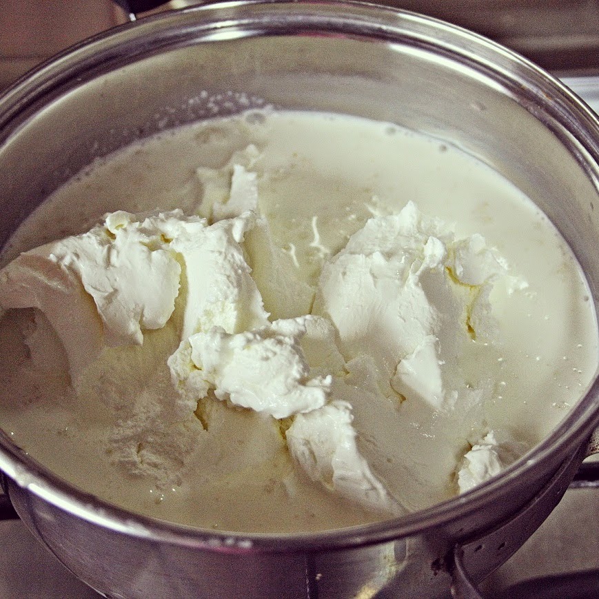3. En la olla echamos todo el queso, la nata (crema de leche), el azúcar y la gelatina. Removemos hasta que hierba y cuando esté listo echamos con cuidado al molde con la base de galleta.