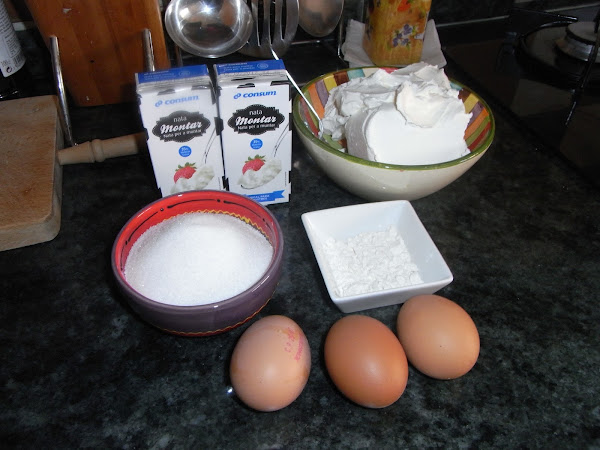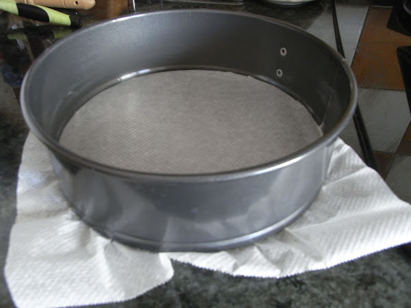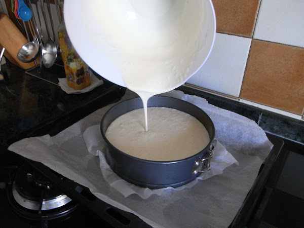 La que yo vi llevaba el doble de ingredientes pero como usé mi molde desmontable de 20 cms. puse la mitad y la verdad es que sale una tarta bien y cuesta menos de cocer. Además del papel lo unté todo con mantequilla.
