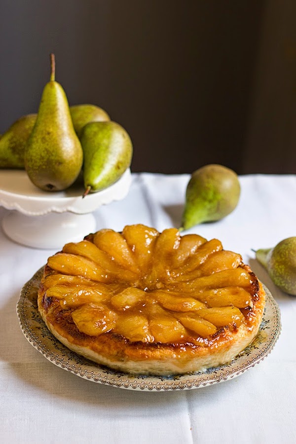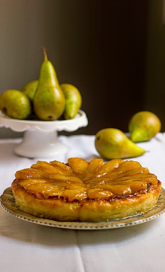 Sacamos del frigo y presentamos con las peras caramelizadas por encima. Yo lo he desmoldado y puesto las peras justo en el momento de servir, para evitar que el toffe de las peras desbordara la tarta.