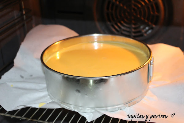 Vertemos esta mezcla en la base de galletas que teníamos reservada en la nevera y horneamos a 180º unos 40 minutos, después bajamos la temperatura a 100º y dejamos acabar 10 minutos más. Dejamos enfriar a temperatura ambiente y después dejamos en la nevera unas horas hasta que se enfríe del todo.