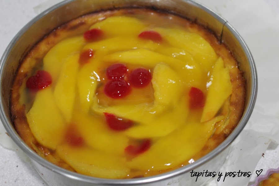 Con la tarta bien fría, decoramos con las tiras de mango y las guindas y vertemos encima la gelatina. Dejamos que solidifique en la nevera unas horas. Mejor prepararla de un día para otro.