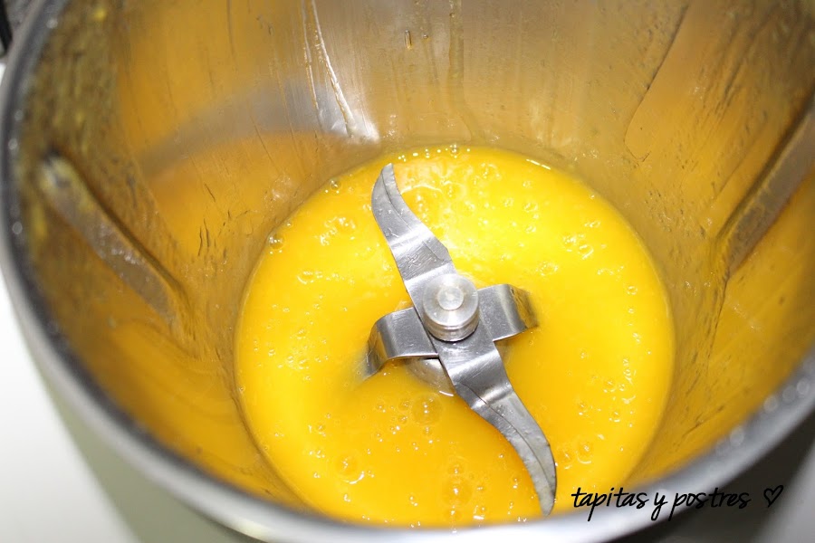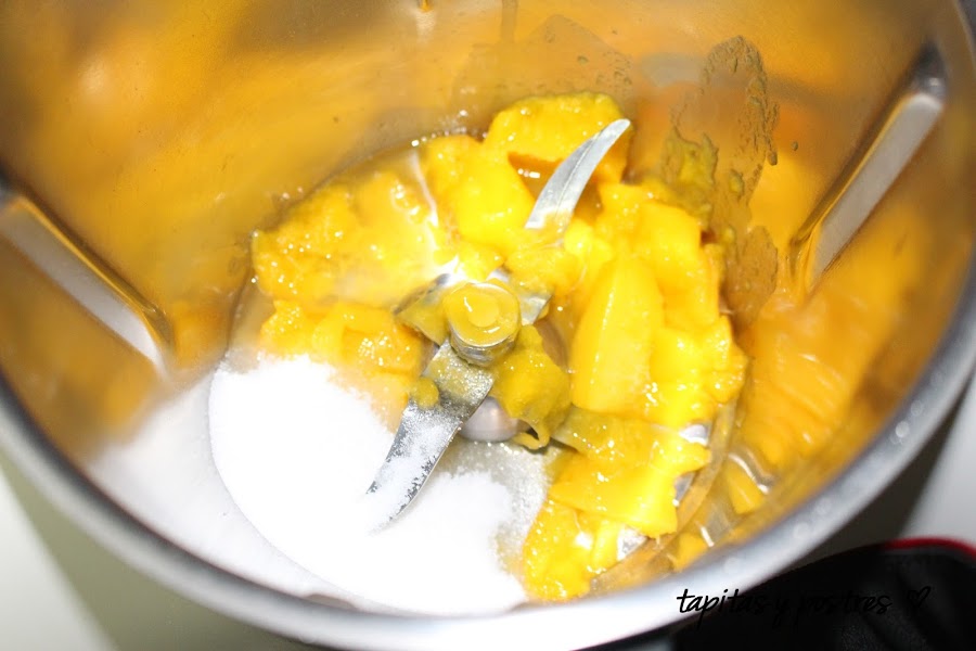 Preparamos la cobertura poniendo a hidratar las hojas de gelatina en agua fría. Mientras trituramos el medio mango que nos quedaba y le añadimos el zumo de limón, el agua y el azúcar.