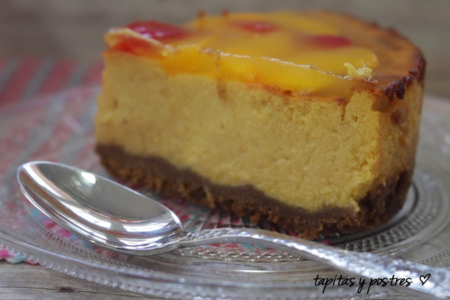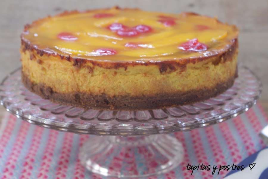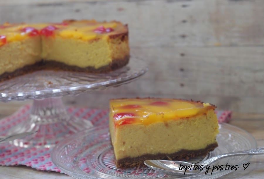 Pero una tarta distinta, de requesón con puré de mango y gelatina de mango en la cobertura. Una tarta suave y no muy empalagosa, con el punto fresco que le da la fruta.