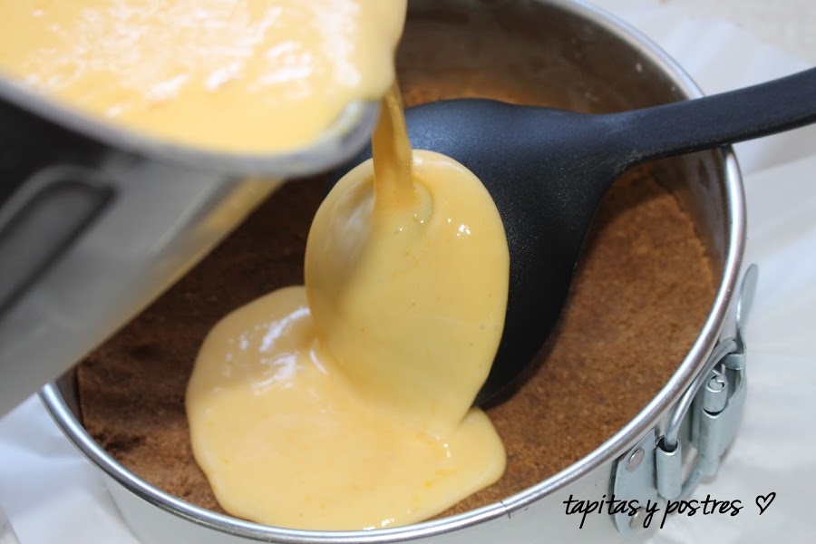 Vertemos la mezcla sobre la base de galletas. Con cuidado que no nos haga un hueco al caer.