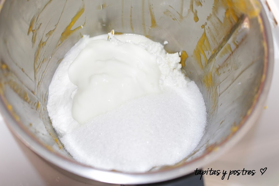 Mezclamos el azucar, el yogur y el requesón.