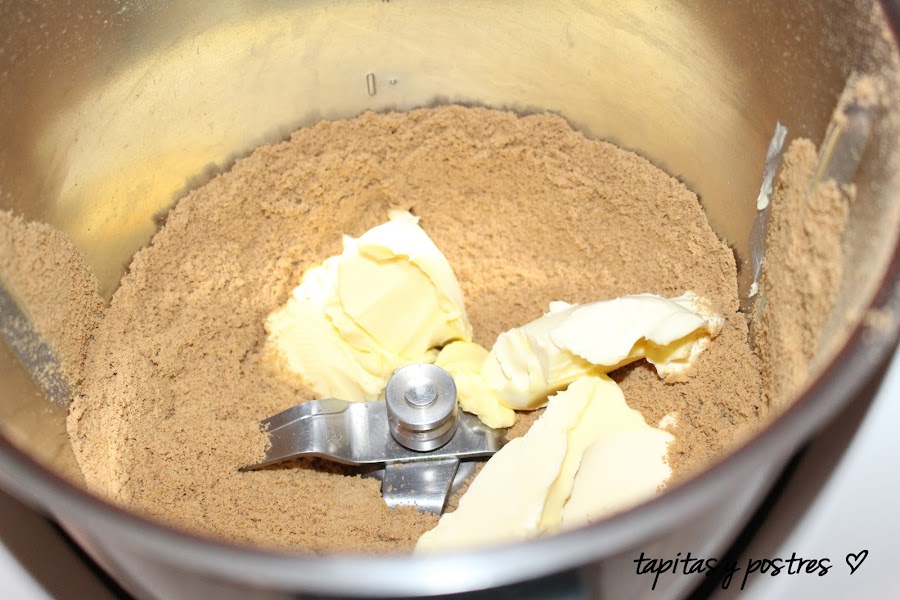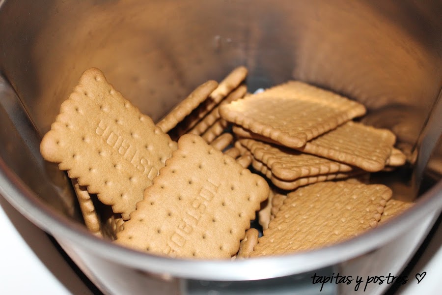 Primero trituramos las galletas en el vaso 5 segundos a velocidad 10. Añadimos la mantequilla blanda y mezclamos 20 segundos a velocidad 4. Colocamos esta mezcla en un molde de unos 22 cm, preferiblemente desmoldable. Dejamos en la nevera una hora.