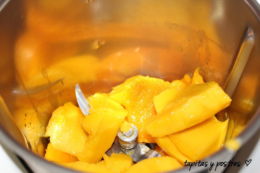 Ponemos un mango y medio troceado y pelado y trituramos.