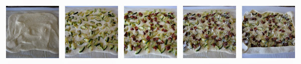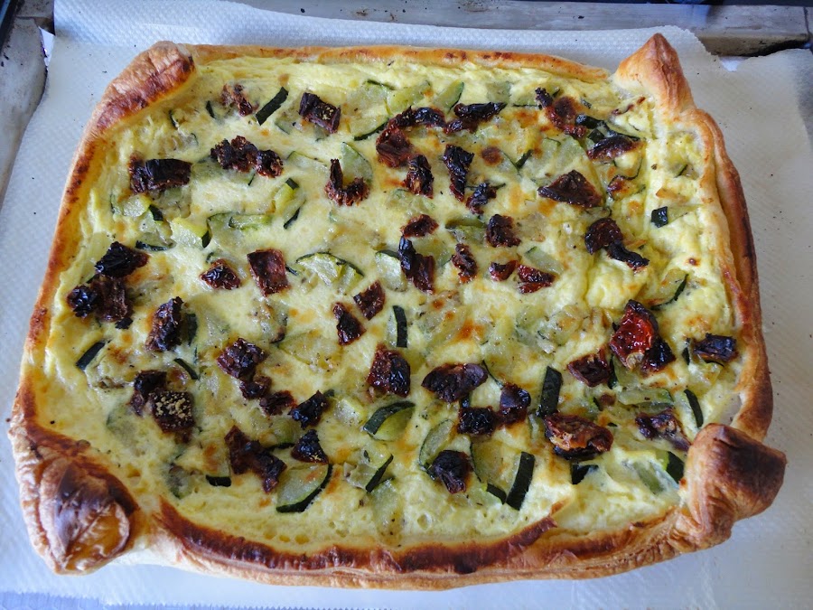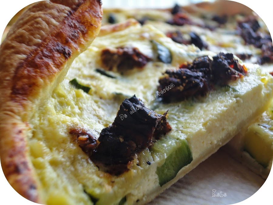 Sobre la crema repartimos el calabacín salteado y los trozos de tomate seco.