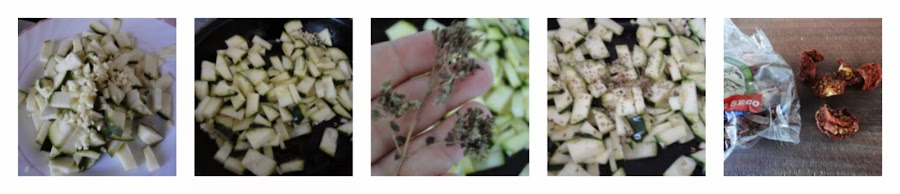 En una sartén, ponemos a calentar 2 cucharadas de aceite y sofreímos el ajo y el calabacín hasta que esté último esté transparente. Salpimentamos y espolvoreamos orégano.