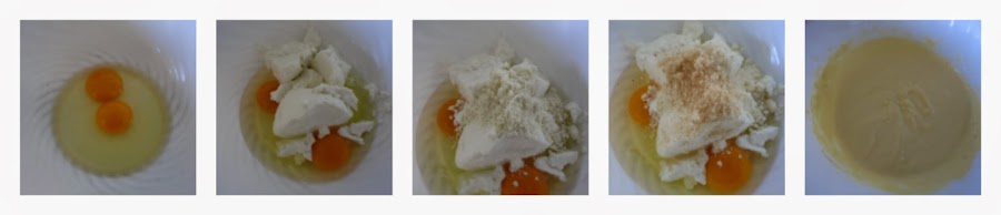 Para preparar la crema de ricotta, ponemos en un cuenco el queso, los huevos, unos 25 gr de parmesano, una buena cantidad de nuez moscada y un poquito de sal. Batimos todo bien hasta obtener una mezcla sin grumos.