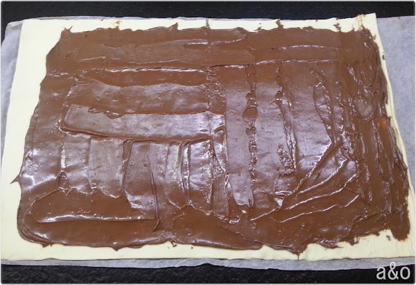1 huevo.Primero. Extendemos la lámina de hojaldre y untamos en ella crema de cacao, pero sin llegar del todo a los bordes. Luego procedemos a enrollarla.