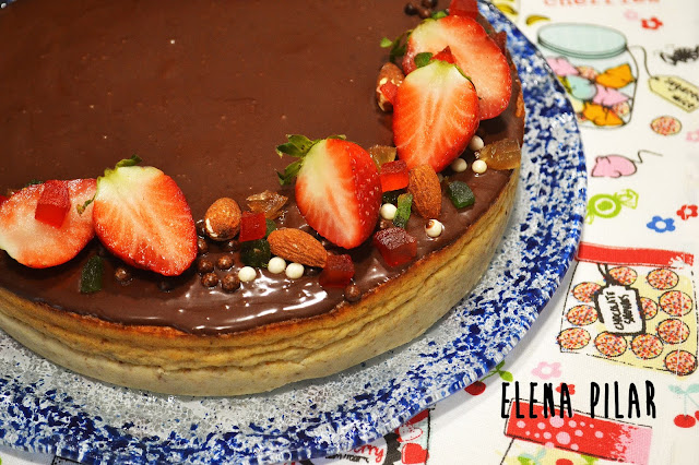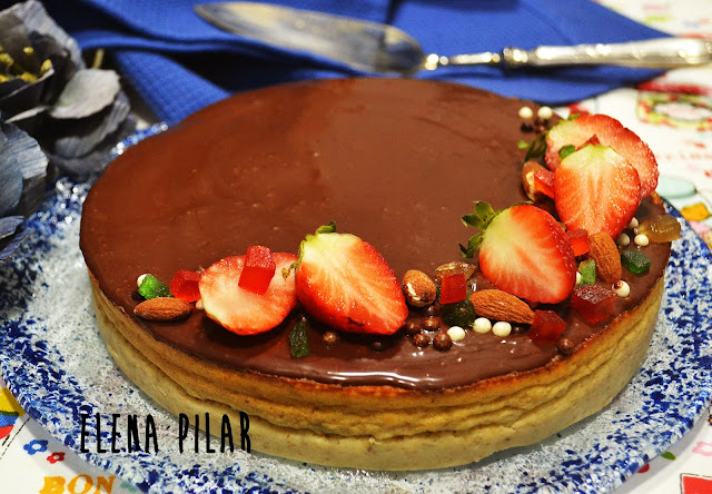 Al día siguiente, picamos muy bien el chocolate para la cobertura. Calentamos la leche justo hasta que rompa a hervir, y la vamos añadiendo poco a poco sobre el chocolate. Removemos continuamente hasta que se derrita todo el chocolate. Vertemos sobre la superficie del pastel desmoldado , y decoramos con unas bolitas de chocolate, unas fresas, almendras y daditos de fruta confitada.