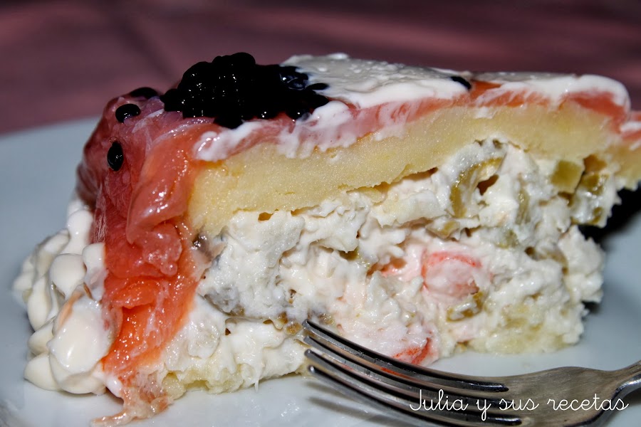 Hoy os traigo otra propuesta para Navidad, una tarta salada de salmón ahumado y merluza que ademas de entrar por los ojos por lo bonita que queda, también está muy buena. Se deja hecha el día de antes y es un primer plato exquisito.