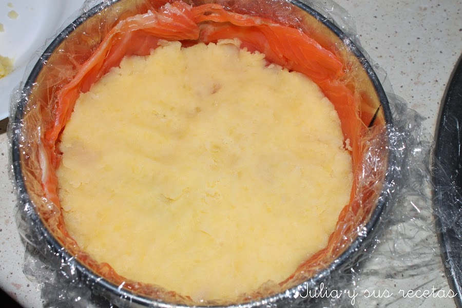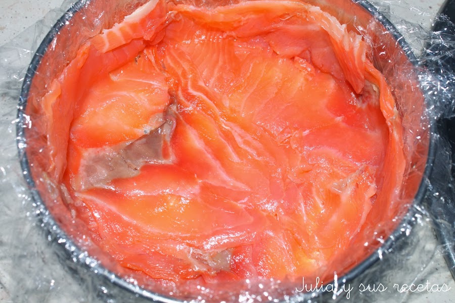 Forramos con film trasparente un molde desmontable y a su vez forramos éste con lonchas de salmón por todos lados, fondo y paredes.