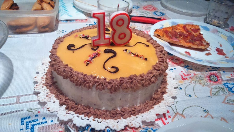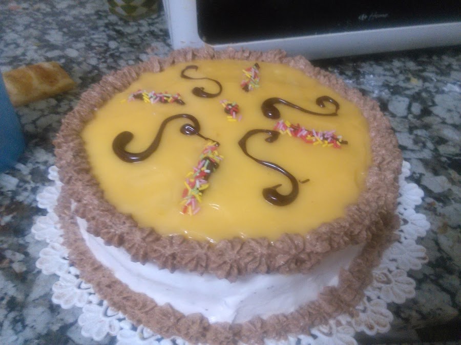 Para el montaje, colocamos una capa de bizcocho la empapamos con ayuda de un pincel de almíbar y la rellenamos con trufa. Hacemos lo mismo con las otras dos capas de bizcocho. Cubrimos los laterales de la tarta con nata (crema de leche) dejándola lo más lisa posible, y ahora vamos con la cobertura que es la yema tostada o crema de yemas.