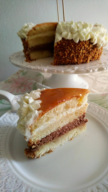 Una vez dispuesto, añadimos la trufa en la base con la manga pastelera. Ponemos la otra capa y añadimos la nata (crema de leche). Tapamos de nuevo y cubrimos con la crema de yema. A mi me sirvió para cubrir la tarta. Dejamos reposar un poco en la nevera para que se asienten las cremas y es que con este calor, me quedaba sin tarta... Luego le añadí las almendras crocantes con ayuda de una rasqueta (así es más fácil) y culminamos decorando con la nata (crema de leche) en los bordes. Dejamos enfriar de nuevo en la nevera hasta el momento de su consumo. Una delicia asegurada!