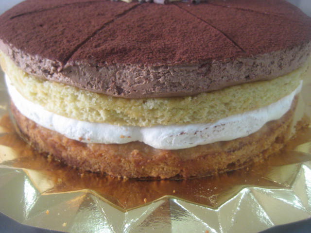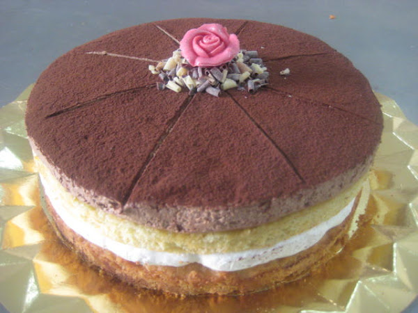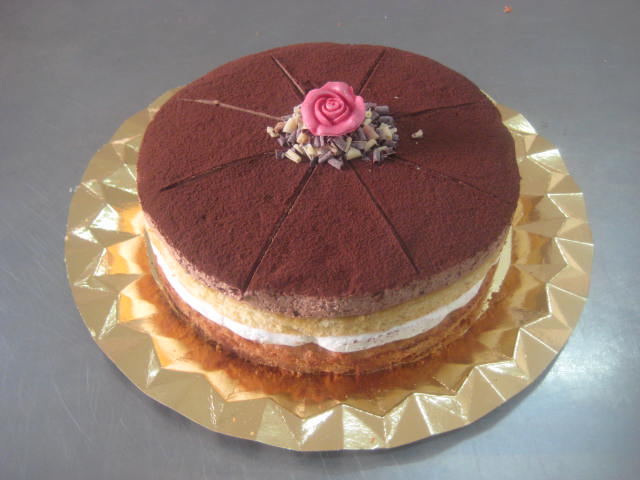 Montaje de la tarta de San Prudencio: Forramos con una tira de papel de semifrío alta un aro de repostería lo suficientemente grande y lo colocamos en la bandeja donde vayamos a servir la tarta. Poner dentro del aro la galleta Seguidamente colocar una capa de bizcocho, empapar ligeramente el bizcocho con el ponche y colocar una capa de nata (crema de leche) Sobre la nata (crema de leche) poner una nueva capa de bizcocho y empapar también con el ponche. Sobre este bizcocho poner una buena capa de trufa y alisar bien la superficie. Dejar reposar en la nevera unas horas. Cuando se vaya a servir cubrir la superficie con cacao en polvo, retirar el aro y el papel de semifrío y terminar con algún detalle al gusto. Si se espolvorea el cacao en polvo muy pronto lo absorbe la trufa y queda feo