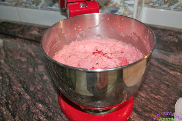 Le añadiremos los sobres de estabilizante y el azúcar glass a gusto de lo dulce que nos guste la nata (crema de leche), el aroma de fresa y por último el colorante alimentario, el aroma y el colorante lo pondremos a nuestro gusto.