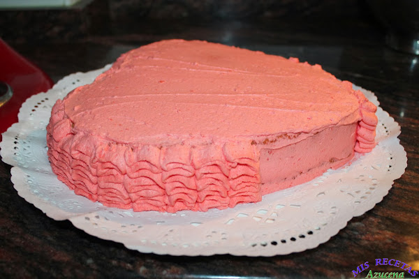 Continuaremos bañando esa capa con nuestro almíbar hasta gastarlo, seguidamente le pondremos con ayuda de una cuchara una capa fina de mermelada de fresas. Una vez está cubierta cogemos una manga con la boquilla redonda y le ponemos una capa de nuestra nata (crema de leche) de fresas por encima de la mermelada hasta cubrir la base.