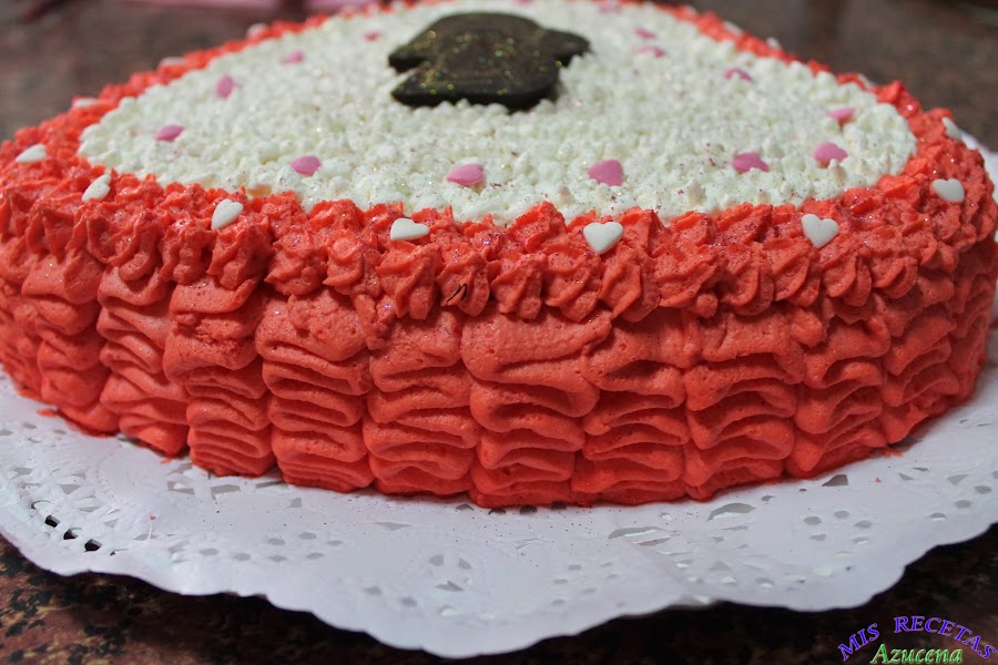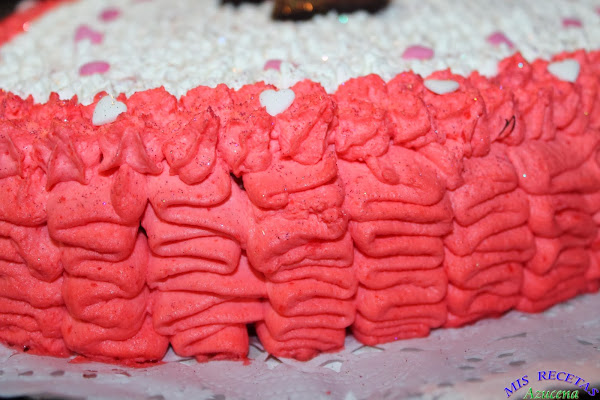 Toca adornar, para ello cogemos una manga con la boquilla korea 150 rellena de nata (crema de leche) con sabor a fresa, empezamos desde abajo hacia arriba haciendo zigzag, así hasta terminar todos los lados tal y como se ve en la foto.