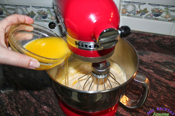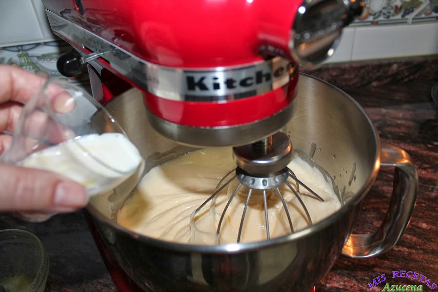 Cuando los huevos este bien espumosos iremos añadiendo poco a poco la mantequilla, una vez tengamos toda la mantequilla añadida añadiremos la leche de la misma forma que la mantequilla, cuando tengamos toda la leche añadida toca a las harinas que teníamos tamizadas que las iremos añadiendo cucharada a cucharada, poco a poco, cuando terminemos con las harinas añadiremos el aroma de vainilla.