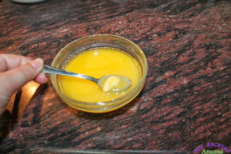 Mientras estamos batiendo los huevos, derretiremos un poco la mantequilla en el microondas, no tenemos que derretirla del todo para que no se nos ponga muy caliente, reservamos.