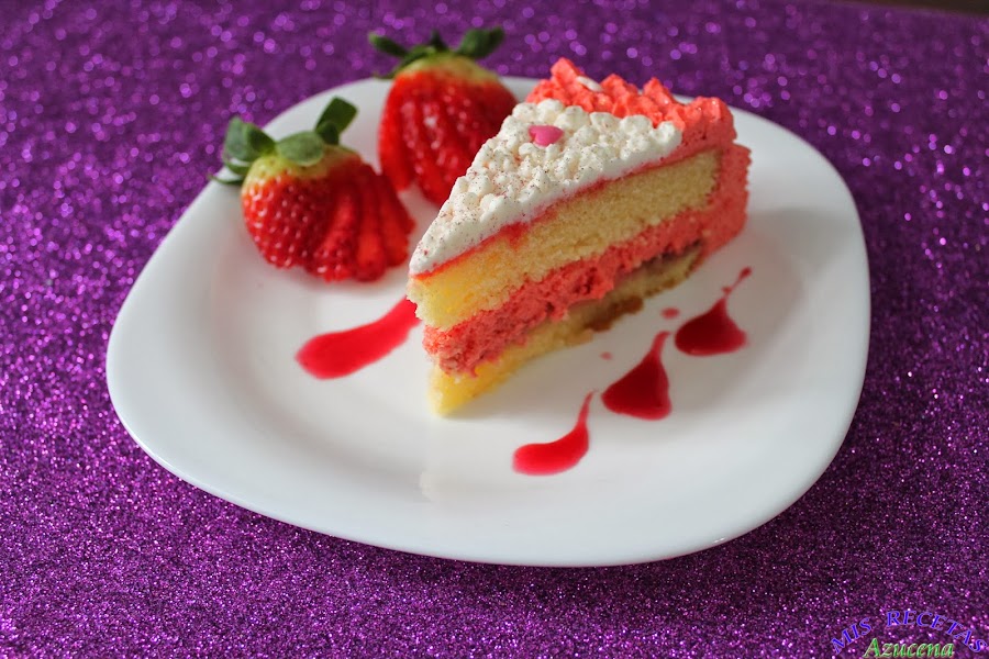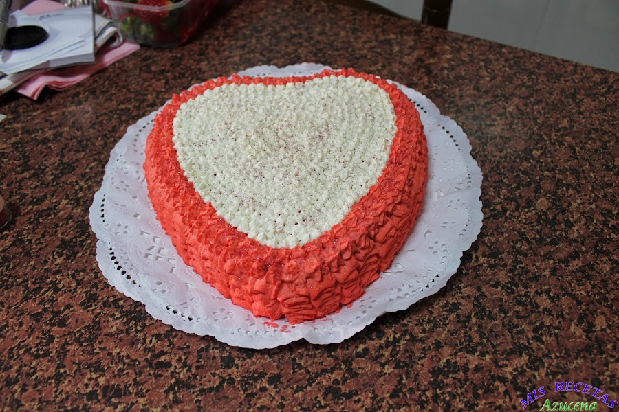 Una vez terminada cubrimos con la otra capa de bizcocho, ahora con ayuda de una espátula de repostería cubriremos toda la tarta con una capa fina de nata (crema de leche) de fresas.