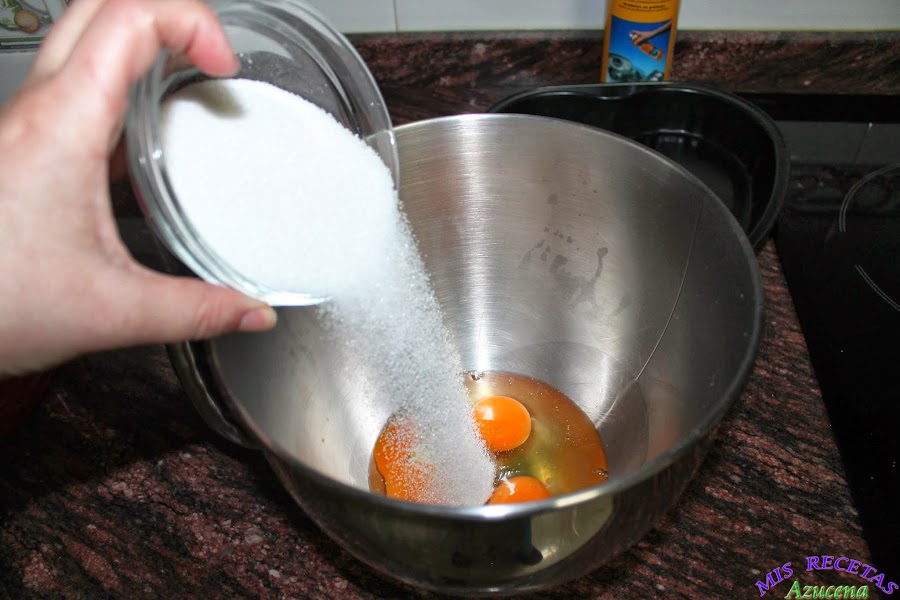 En un bol añadiremos los huevos y el azúcar, batiremos con ayuda de unas varillas eléctricas o a mano.