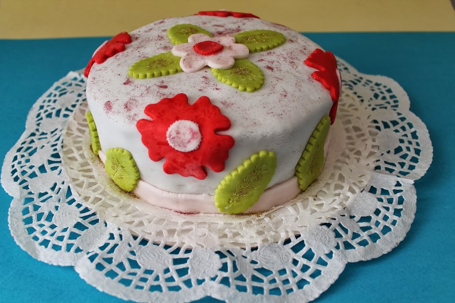 Por ultimo nos queda la manga pastelera con la boquilla nº 2, en ella pondremos la nata (crema de leche) blanca e iremos haciendo puntitos más pequeños que los de los filos hasta cubrir todo el centro.
