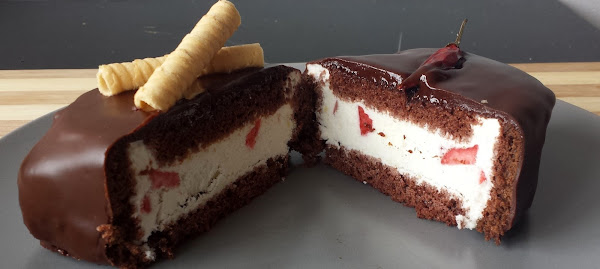 6. Recortamos el bizcocho y lo vaciamos con una puntilla con el centro sacamos dos laminas que nos serviran de tapa, ponemos una debajo y rellenamos con la nata (crema de leche) con fresas y tapamos con la otra tapa, congelamos al menos 12 horas.