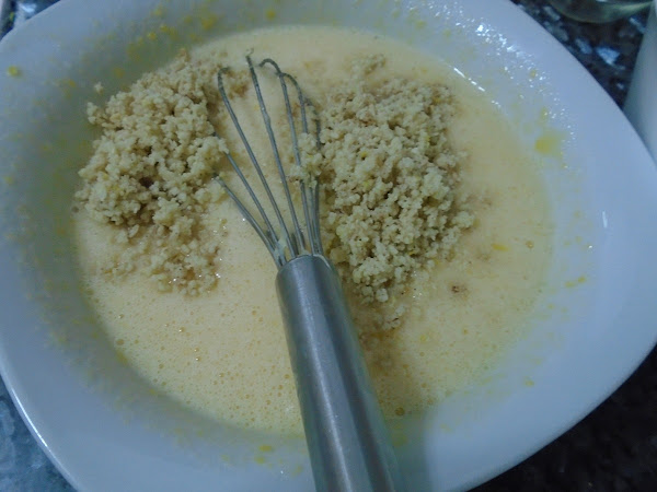 Añadimos la mezcla de almendra a la mezcla de huevos y azúcar poco a poco y con la ayuda de una espatula o varillas vamos a ir mezclandolo hasta que este todo integrado.