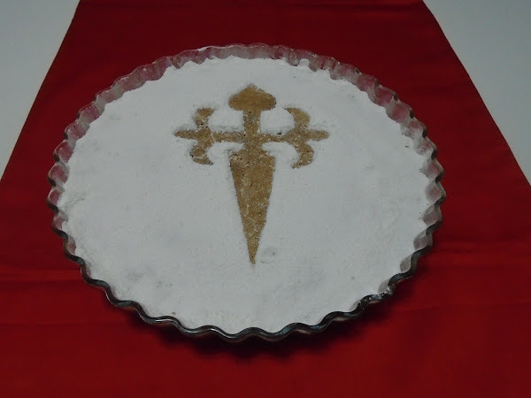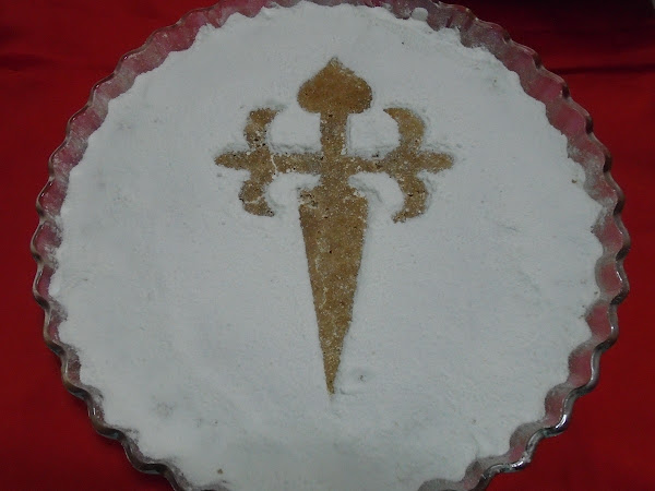 Una vez que este fría con la ayuda de nuestra plantilla de la cruz de Santiago depositamos en el centro de la tarta y rociamos la tarta con azúcar glas.