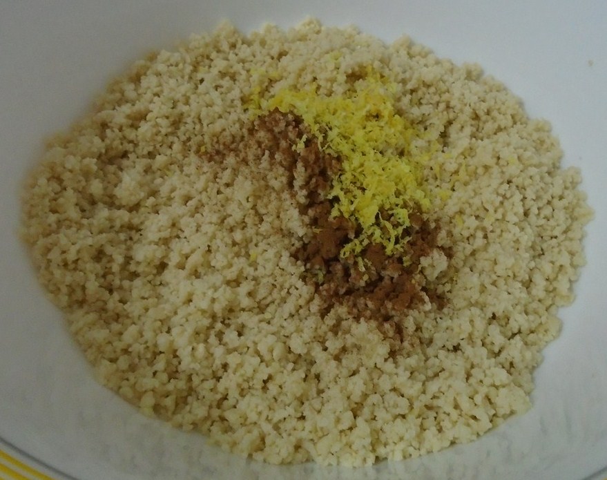 En un bol introducimos la almendra molida, la canela y el limón, mezclamos para que quede todo bien integrado y reservamos.