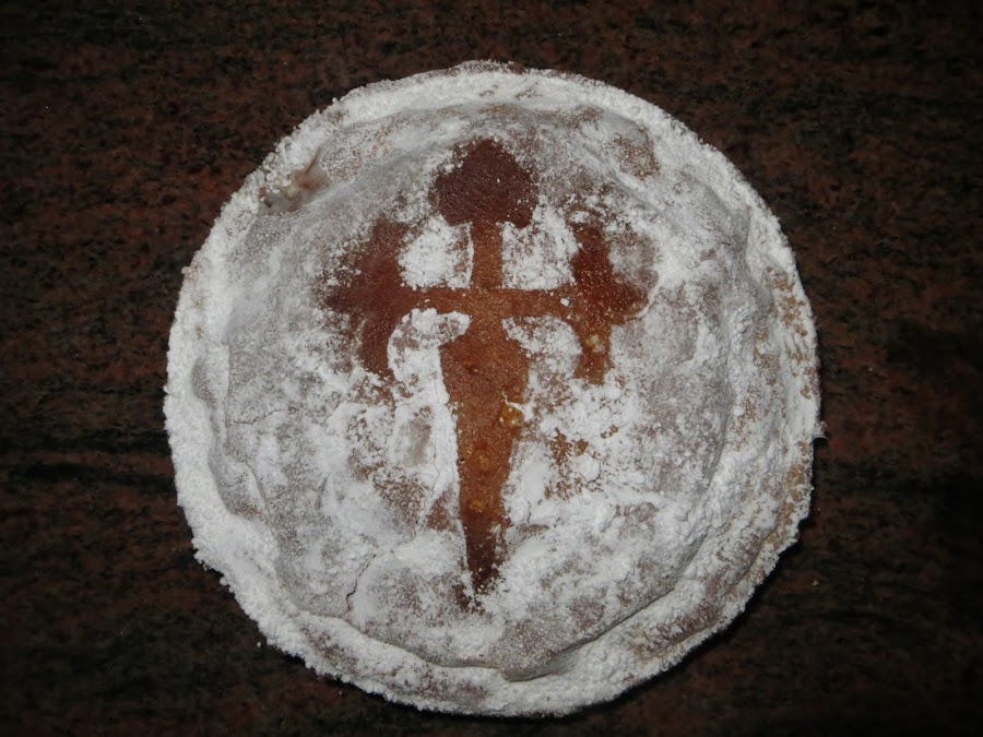 Sacamos la tarta del horno, dejamos que se enfríe, ponemos la plantilla de una cruz de Santiago encima de la tarta y espolvoreamos azúcar glass, retiramos la cruz y ya está lista para comer.