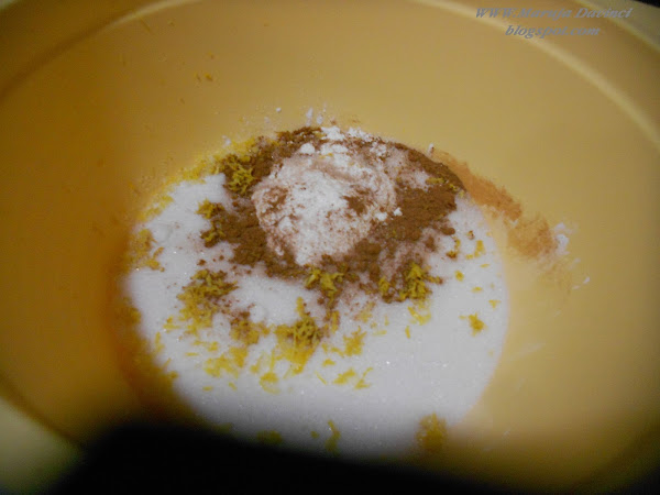 Mezclar la almendra, el azúcar, la ralladura de limón, la canela, la levadura y los huevos uno a uno removiendo , no batiendo.