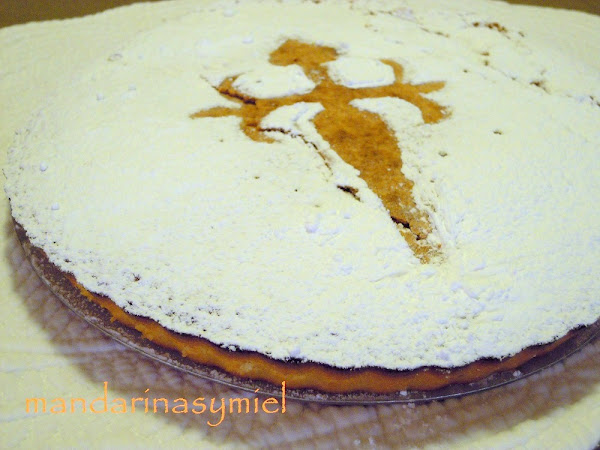Es una tarta muy sencilla de preparar, pero a mi al final se me ha complicado, casi se me rompe toda. La he hecho en un molde de silicona y al sacarla del horno se me ha doblado un poco y se ha abierto por un lado.....quería morirme!!! Mi consejo es que la hagas con un molde duro, desmoldable, así no se te doblará.Luego he hecho la plantilla y cuando la he puesto encima de la tarta, la parte de abajo de la cruz se levantaba, no había manera de que quedara sobre la masa....pero bueno pese a todo eso la tarta está deliciosa, nos ha encantado a todos, casi se la han comido caliente.