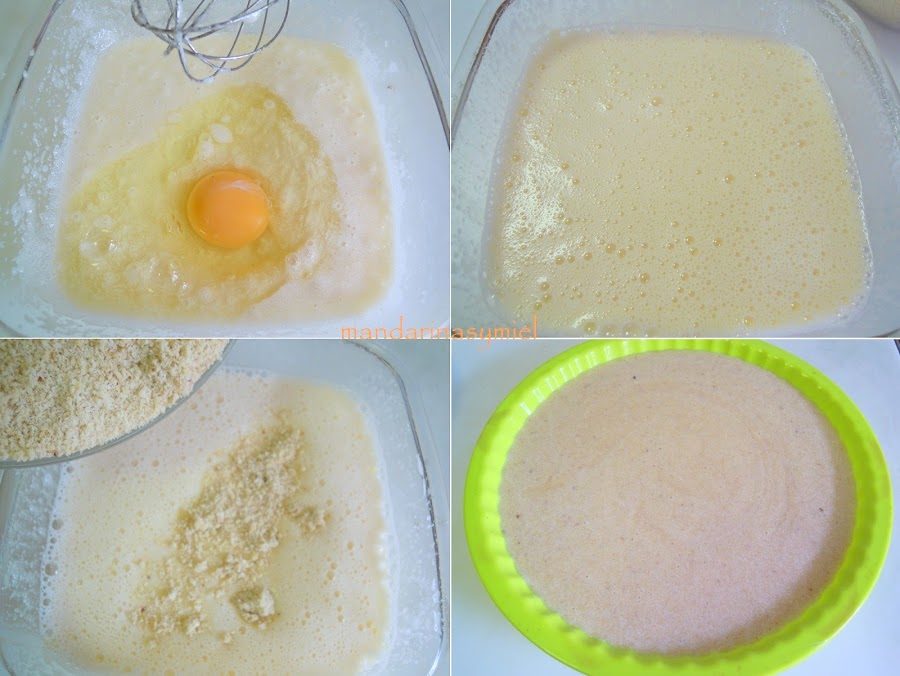 Unta el molde con un poco de mantequilla y echa la mezcla de almendras y huevos.