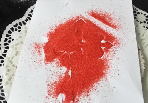 Ponemos la plantilla negativa y espolvoreamos en el hueco el azúcar rojo. Cuidado porque yo he tenido un problema: al ir a quitar la cruz se me ha caído parte del azúcar rojo en la tarta. Lo que tenéis que hacer para que no os pase es empujar el azúcar rojo que os haya quedado en la plantilla hacia la cruz para que no quede nada en la plantilla antes de quitarla.