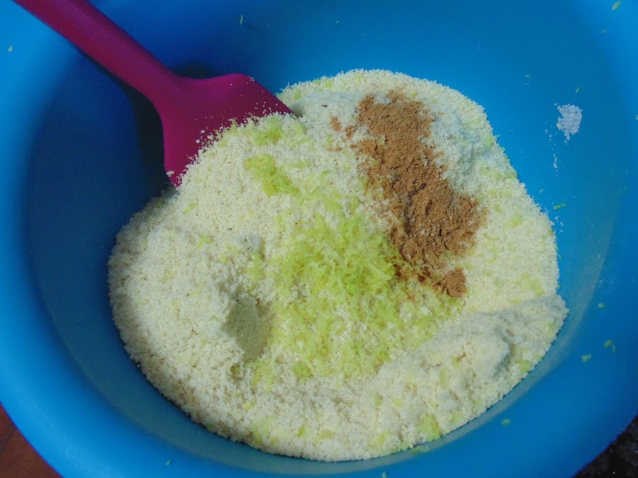 Añadimos la almendra, ralladura de limón y la canela a un bol y mezclamos con la ayuda de una espátula o tenedor.