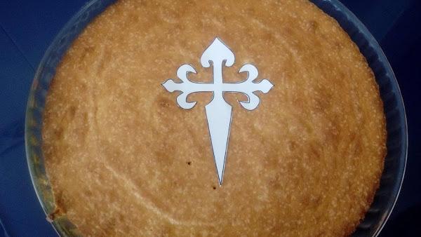 Imprimid una cruz de Santiago, la ponéis sobre la tarta una vez haya enfriado y espolvoreáis bien de azúcar glass, yo lo suelo hacer con un colador. Mucho cuidado al levantar la cruz, coged bien por los dos extremos para que no se os estropee la decoración.