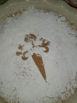 Colocamos el símbolo al centro y se espolvorea de azúcar glass, te recomiendo pegar el símbolo impreso en un cartón para que sea más fácil de retirar cuando lo espolvorees, si usas una hoja común, lo más probable es que se doble al levantarla y el azúcar que tenga encima caerá sobre la tarta, lo que hará que se estropee la Cruz.