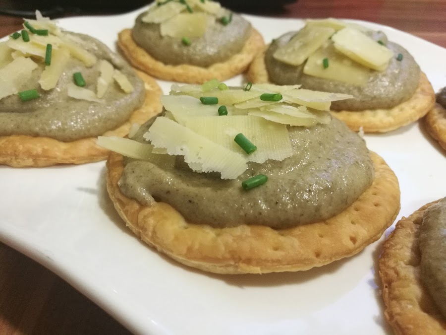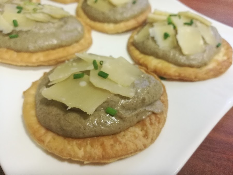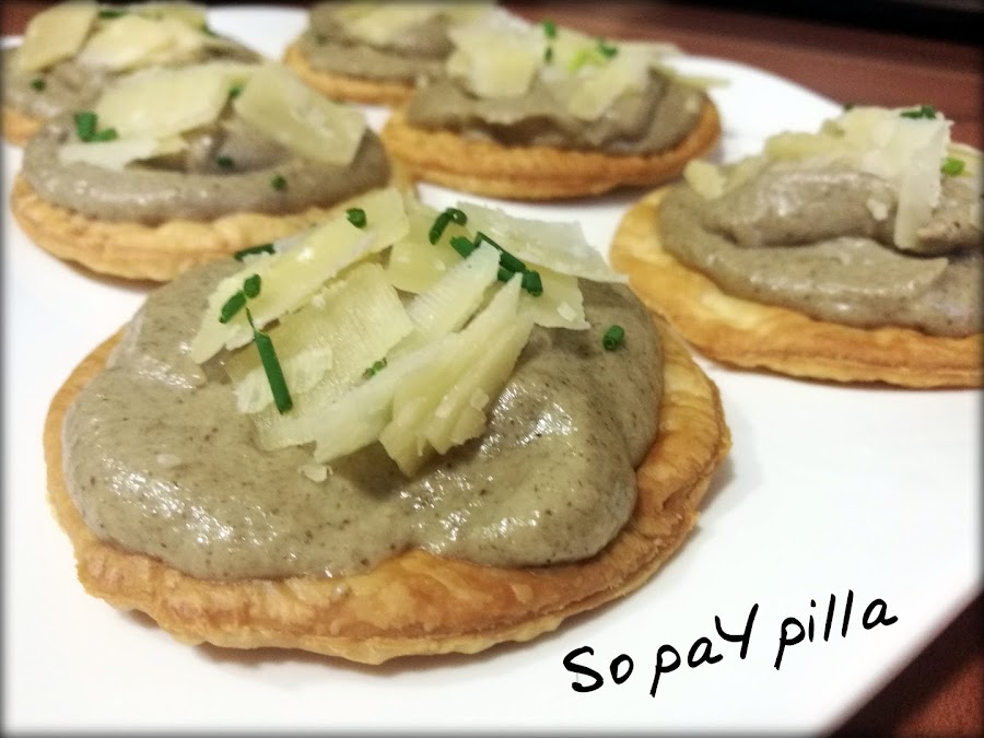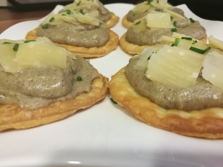 - Poner la crema de setas sobre cada hojaldre, el parmesano, y decorar con el cebollino.