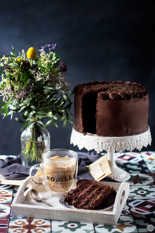 Lo mejor es que el bizcocho es muy jugoso, sin necesidad de almibararlo, y aguanta bien un par de días. En su elaboración incorpora agua y leche, lo que lo humedece bastante y el resultado es fantástico. La crema de cobertura de chocolate es una delicia y el relleno os va a conquistar, os lo digo yo. La llevé para que se la comiesen mis compañeros de trabajo... ¡Y no sobró nada... Y eso que es enorme!