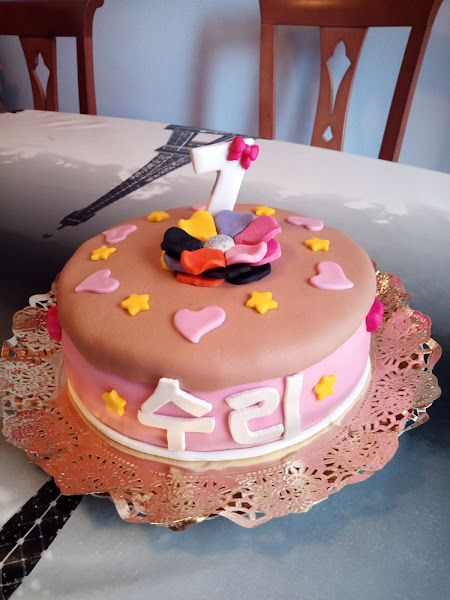 Hace unos dias atràs me pidieron Hyon Je y Ho Jae que hiciera la tarta para su hija Suri. Cumplia 7 años y querìa celebrarlo con una tarta diseñada por ella misma. Y asì fuè, le dije a Suri que me explicara como querìa su tarta para su dìa. Empezo a explicarmela y para estar mas segura le pedi que me dibujara la tarta que le gustaria tener.
