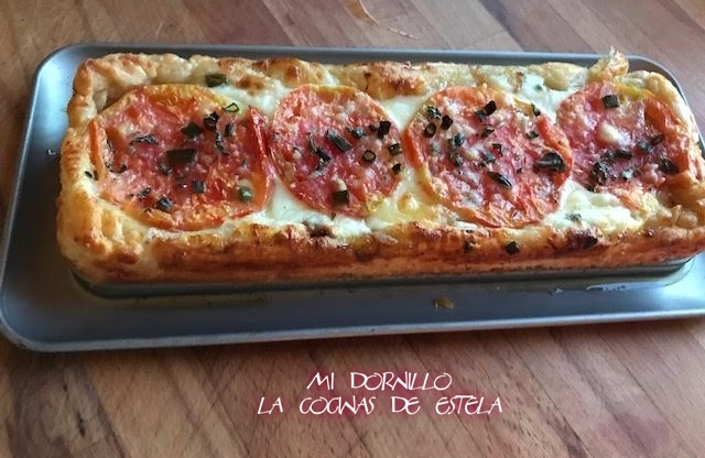 Sofreír la cebolla en juliana, cuando este dorada le ponemos la cucharada de cebolla caramelizada y movemos bien. Apartamos, preparamos el molde con el hojaldre, lo pintamos con huevo por los bordes. Ponemos primero la cebolla, encima el queso blanco en lonchas y encima el parmesano rallado. Por ultimo ponemos el tomate en rodaja y le añadimos el orégano.