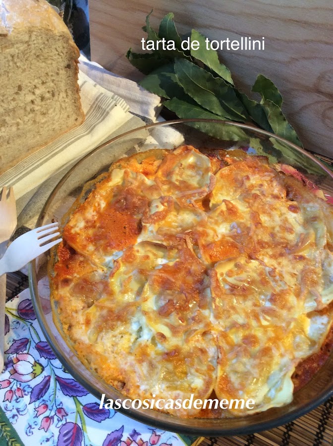 En una fuente apta para el horno, ponemos primero el sofrito, encima colocamos los tortellini con un poco de graciavertemos por encima la nata (crema de leche) tal cual está tratando de cubrir los tortellini, el queso rallado, y unos trocitos de mantequilla.
