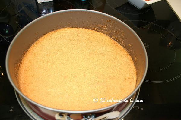 Una vez picada, la mezclaremos con la mantequilla hasta obtener una mezcla tipo arena mojada, y la pondremos en el molde desmoldable, esparcida y prensada con la cuchara por toda la base y el siguiente paso se puede hacer de dos maneras ó se mete en el horno unos minutos para que se ponga durita y crujiente, o se deja enfriar en elcongelador, incluso en elfrigo y entonces no usamos para nada el horno.